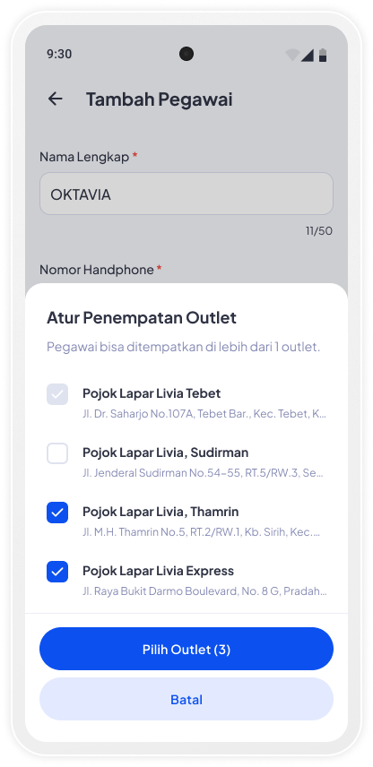 Atur penempatan pegawai baik pada 1 atau beberapa outlet
