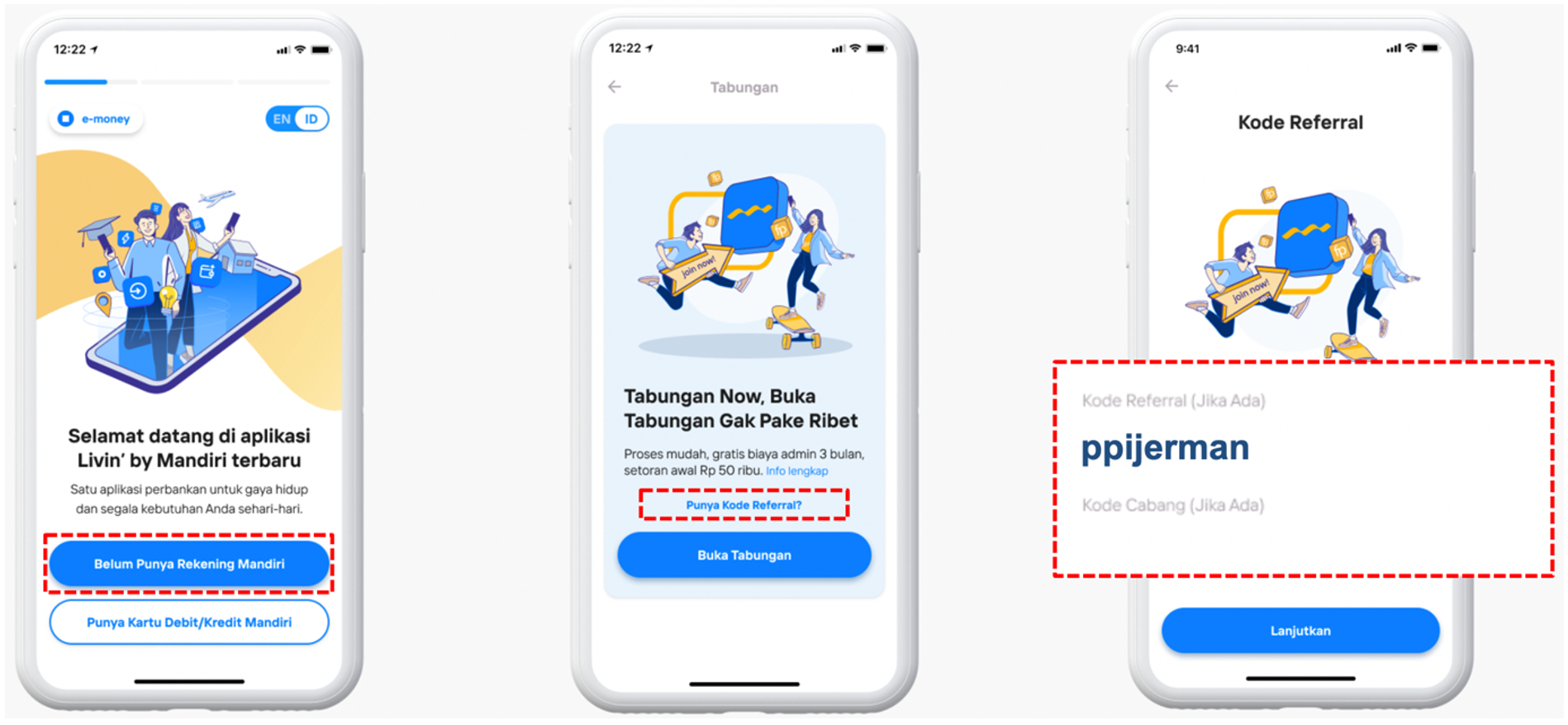 - Calon nasabah baru wajib scan QR/klik link referral atau memasukkan kode referral ppijerman pada saat akan buka rekening online melalui Livin’ by Mandiri