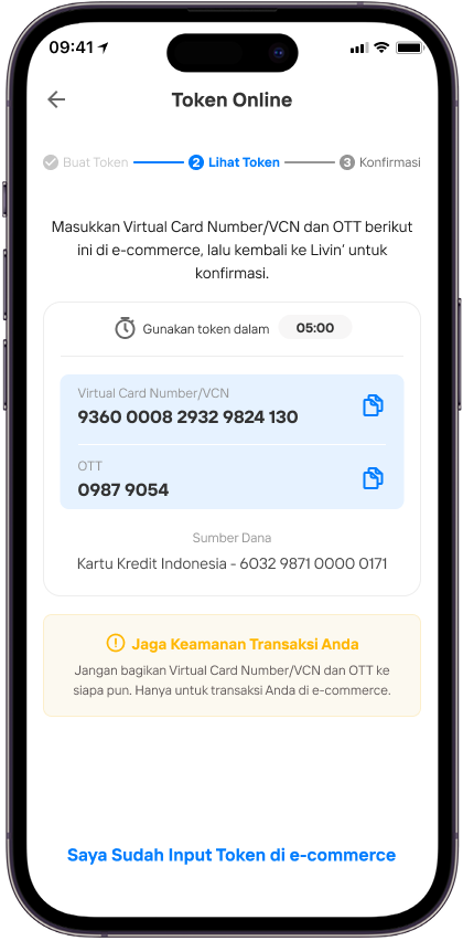 Salin kode VCN dan OTT yang muncul, kemudian masukkan atau tempelkan pada halaman pembayaran merchant yang dituju.