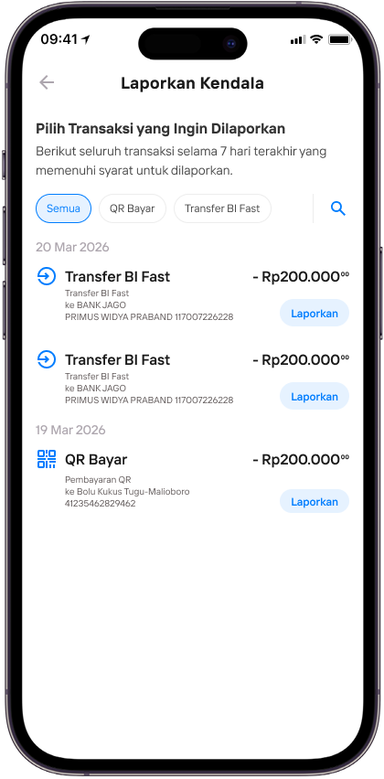 Pilih transaksi QR Bayar atau Transfer BI Fast yang ingin dilaporkan