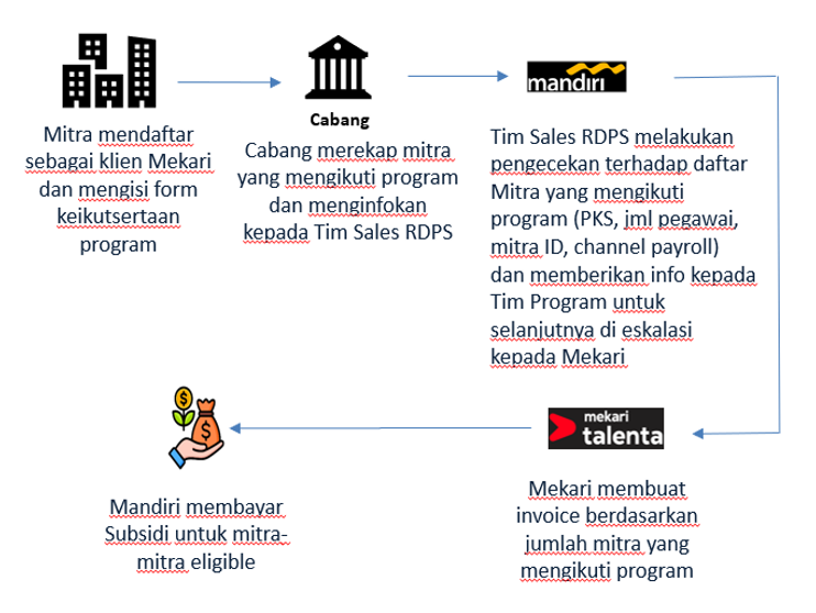 Program berupa subsidi biaya berlangganan HR Platform dari Mekari Talenta yang diberikan oleh Bank Mandiri untuk Mitra Payroll terpilih. Dapat diberikan kepada Mitra baru maupun Mitra eksisting.