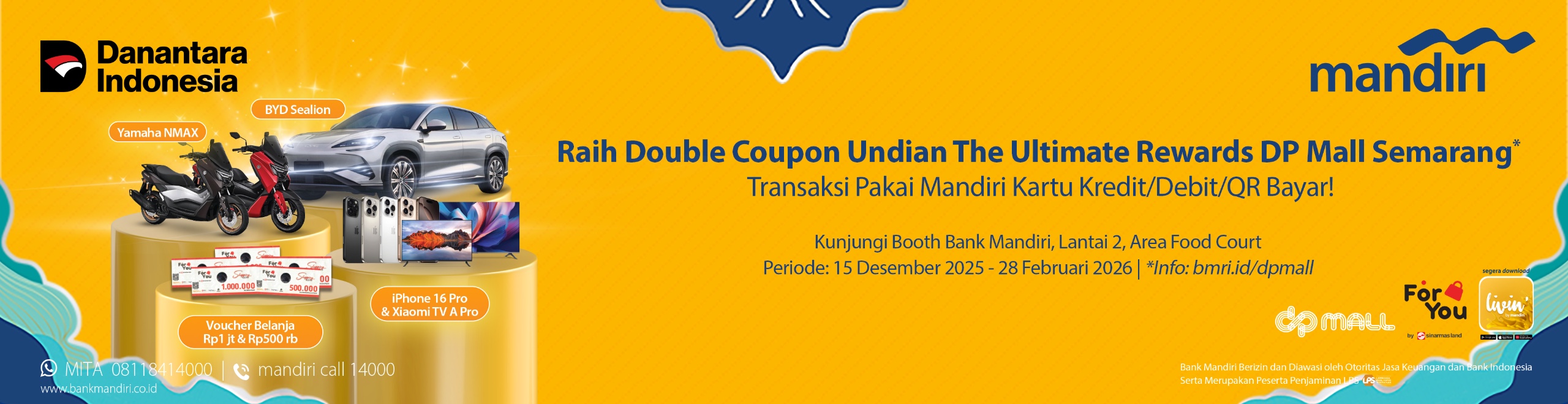 - Bonus Voucher Belanja di merchant DP Mall Semarang Rp50 ribu dengan transaksi menggunakan Mandiri Kartu Kredit/Debit, dan QR Bayar Livin' by Mandiri