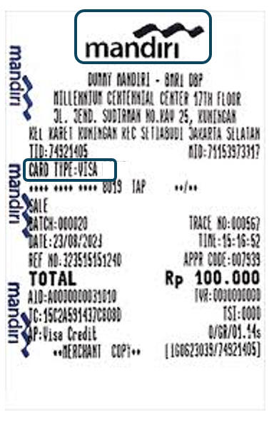 Struk transaksi yang eligible untuk program adalah struk dengan logo Bank Mandiri dan keterangan card type berupa On Us atau Kartu Debit/Kredit Mandiri.