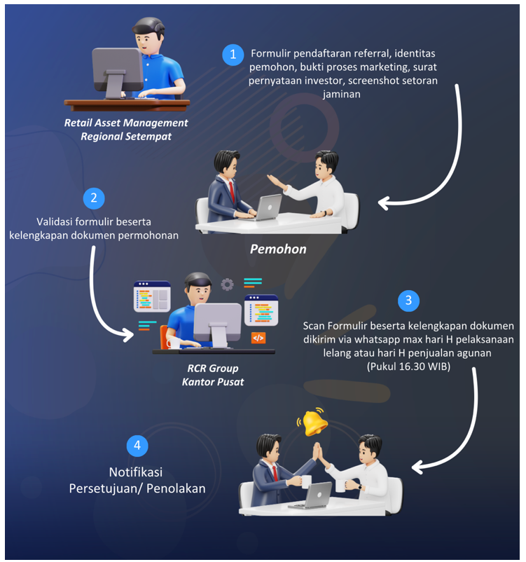 Pemohon mengisi formulir pendaftaran referral, Scan Identitas Pemohon (ID Card untuk pegawai internal), dengan melampirkan keseluruhan bukti/dokumentasi proses marketing beserta surat pernyataan investor, dan screenshot setoran jaminan lelang kemudian diserahkan ke Retail Asset Management Bank Mandiri Regional setempat.