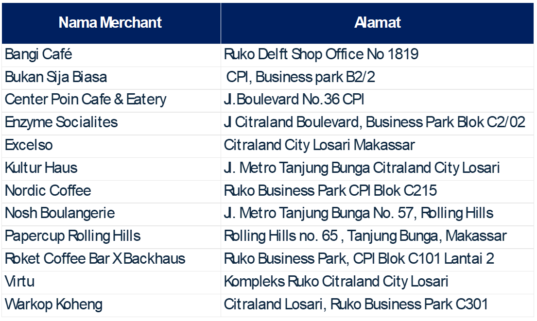 Merupakan cashback sebesar Rp15 ribu untuk nasabah Bank Mandiri di Region X/Sulawesi & Maluku baik nasabah baru maupun nasabah eksisting yang melakukan transaksi Bayar QR di Kawasan Metro Tanjung Bunga dengan channel pembayaran Livin’ by Mandiri (icon kuning).