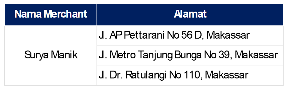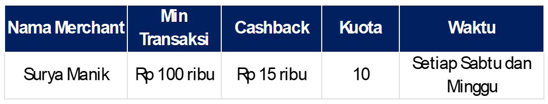- Program berlaku untuk nasabah baru dan nasabah eksisting yang bertransaksi di merchant RM Surya Manik