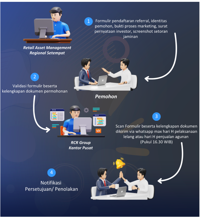 - Apabila sampai dengan hari H pelaksanaan lelang atau hari H pelaksanaan jual beli agunan (sebelum pukul 16.30 WIB) pemohon tidak mengirimkan formulir beserta kelengkapan dokumen secara lengkap via whatsapp referral kepada PIC di Kantor Pusat RCR Group (Retail Collateral Management & Legal Department), maka pengajuannya tidak dapat diproses.