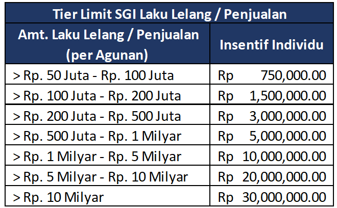 Jumlah nominal laku lelang dalam program Mandiri Insentif Lelang adalah yang terbesar dalam 1 Area/Department setiap bulannya. |