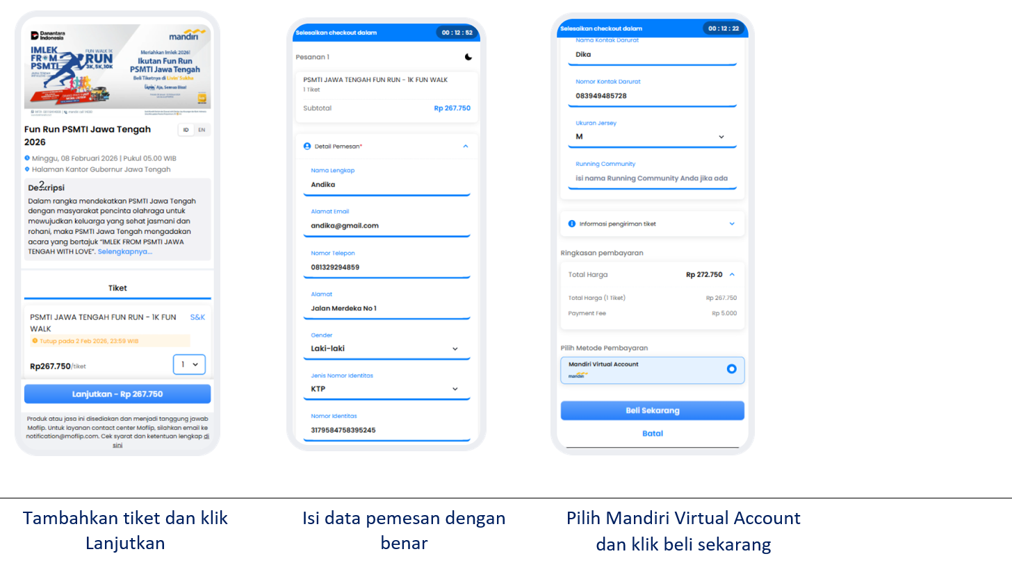 Pembelian Fun Run PSMTI Jawa Tengah 2026 dapat dilakukan di Livin’ by Mandiri melalui Mandiri Virtual Account dengan Sumber Dana Tabungan dan Mandiri Kartu Kredit