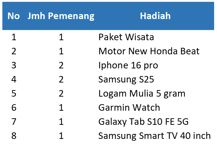 - Hadiah terdiri dari dua yaitu grand prize yang akan diumumkan pada saat akhir periode program dan monthly prize yang dapat merupakan hadiah bulanan yang akan diumumkan setiap bulan.