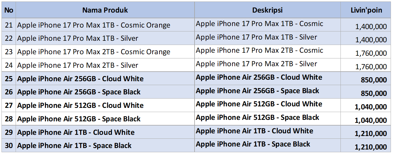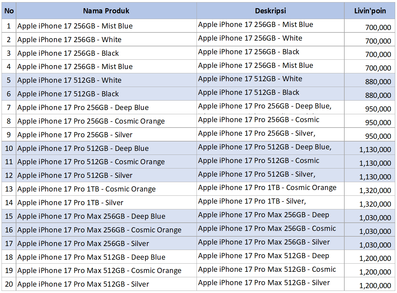 - Jumlah Livin’poin yang dapat ditukarkan oleh dengan iPhone 17 oleh nasabah adalah sbb :