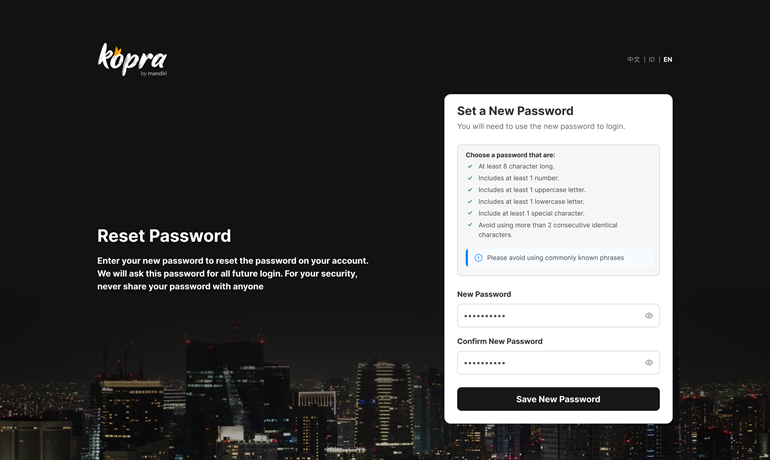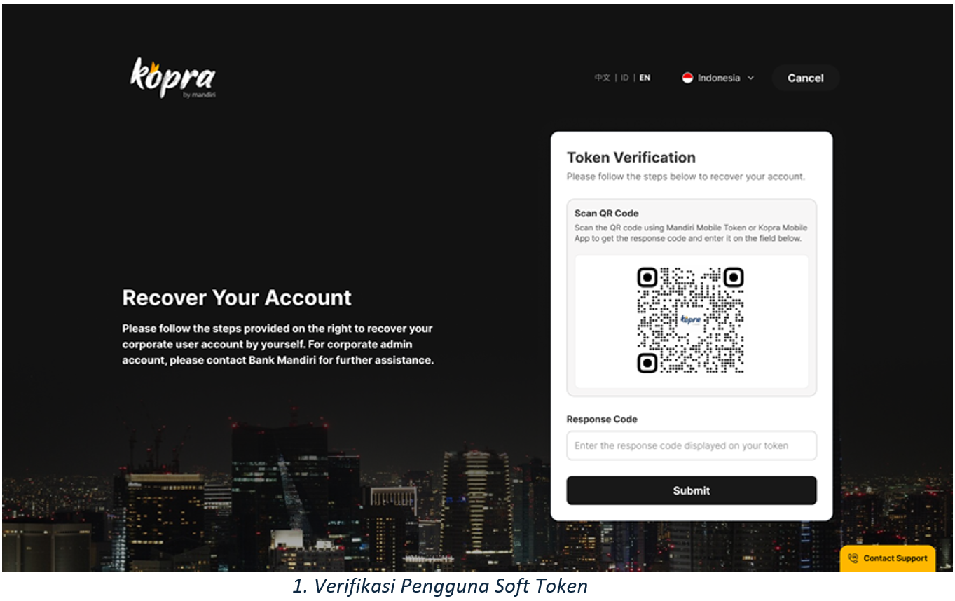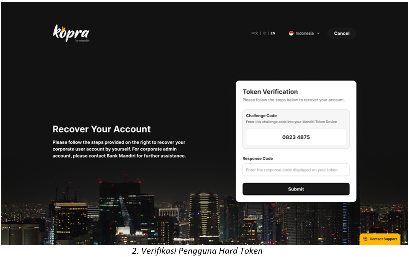 Semua Corporate User dapat menggunakan fasilitas self-service recovery. Namun, untuk Corporate Admin, proses unlock akun tetap harus dilakukan oleh Bank Mandiri melalui BBO Kopra.