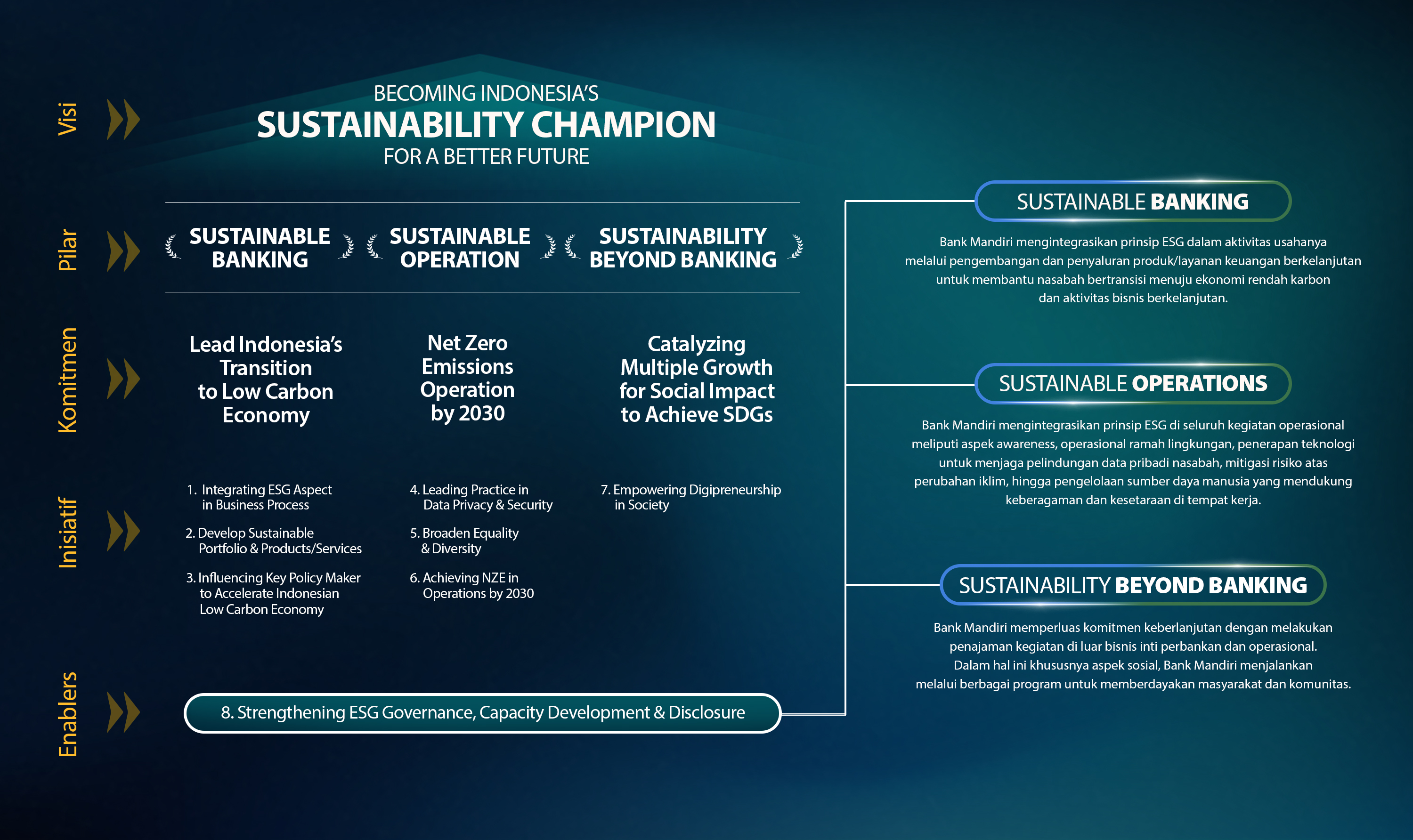 Menerapkan prinsip keberlanjutan yang mendukung bisnis, operasi, dan masyarakat melalui penyelarasan aspek ESG